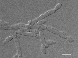 Die Hefe Ascoidea asiatica unter dem Mikroskop. Der Balken im Bild entspricht 5 Mikrometer (Millionstel Meter).