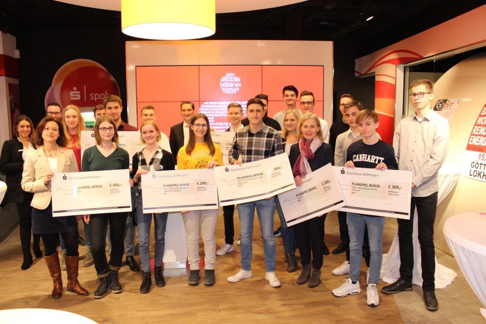 Die Sparkasse Göttingen hat die Sieger des 36. Planspiels Börse ausgezeichnet. Die drei Bestplatzierten in der Depotgesamt- und Nachhaltigkeitswertung erhielten Preise im Gesamtwert von 5.700 Euro. Bei den Studierenden setzte sich das Team „Fortunix“ von der Georg-August-Universität durch. Bei den Schülern siegte das „Team AMY“ dreier Schüler von der BBS 1 Göttingen Arnoldi-Schule. Im Bereich der Anlagestrategien erwirtschaftete das Team „704105“ von der BBS 2Göttingenden höchsten Nachhaltigkeitsertrag. Ziel des Planspiels Börse ist die Auseinandersetzung mit Finanzen und nachhaltigen Geldanlagen. Dabei müssen auch deren Kriterien und Auswahlverfahren berücksichtigt werden.
