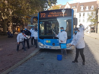 Gestern Mittag hat an der Bushaltestelle am Markt in der Göttinger Innenstadt eine Guerilla-Marketingaktion der Göttinger Verkehrsbetriebe (GöVB) stattgefunden. Ziel der Aktion war es, die Fahrgäste über die Desinfektionsmaßnahmen in den Göttinger Stadtbussen zu informieren. Durch eine Demonstration des Reinigungsvorgehens erhoffen sich die GöVB wieder mehr Menschen dazu zu bewegen, in den Bus anstatt ins Auto zu steigen. Die Hintergründe der Aktion erklärt der Geschäftsführer der Göttinger Verkehrsbetriebe, Michael Neugebauer: „Wir drehen gerade einen kleinen Film, wo wir in einer gestellten Szene zeigen, dass wir unsere Busse außen und innen von so einer mobilen Eingreiftruppe reinigen. So ein bisschen wie ein Boxenstopp bei der Formel 1. Der Hintergrund ist natürlich der - wir machen eine Menge. Unsere Busse werden zusätzlich gereinigt. Sehr gründlich in der täglichen Reinigung. Und wir haben tatsächlich eine mobile Eingreiftruppe, die tagsüber im Liniennetz Busse von innen reinigt.“ Neben gründlichen Desinfektions- und Reinigungsmaßnahmen sorgen außerdem die Klimaanlagen der Stadtbusse für einen effektiven Luftaustausch. Dieser wird durch das regelmäßige Öffnen der Türen an den Haltestellen zusätzlich unterstützt. Darüber hinaus setzen sich die GöVB auch für eine Einhaltung der Maskenpflicht ein. Eine von den GöVB, dem Ordnungsamt und der Polizei gegründete Sicherheitspartnerschaft suche beispielsweise den Austausch mit Fahrgästen, die keine Maske tragen. Alle von den GöVB ergriffenen Maßnahmen sind im Vornherein mit den Gesundheitsämtern abgesprochen worden.