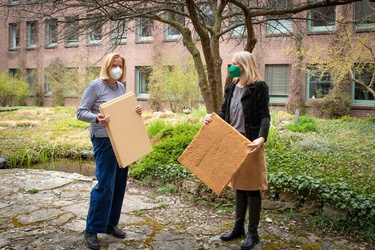 Nachhaltiges Bauen: Die Verwendung zertifizierter Dämmstoffe bei der Altbausanierung wird vom Landkreis Göttingen gefördert, die Energieagentur Region Göttingen betreut das Programm. Erste Kreisrätin Christel Wemheuer (l.) und Energieagentur-Geschäftsführerin Doreen Fragel zeigen, worum es geht. (Bild: Energieagentur Region Göttingen)