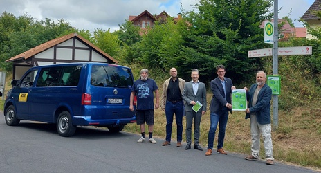 AnrufLinienTaxi (ALT) für die Anbindung von Ertinghausen nach Hardegsen. v.l.n.r.: Georg Schmitt (Taxi Schmitt im Auftrag von RBB), Markus Menge (ZVSN, Mobilitätsmanager), Jan-Christopher Linck (Landkreis Northeim, Kreisentwicklung), Lars Gunnar Gärner (Bürgermeister der Stadt Hardegsen), Georg Klute (Ortsbürgermeister Ertinghausen).