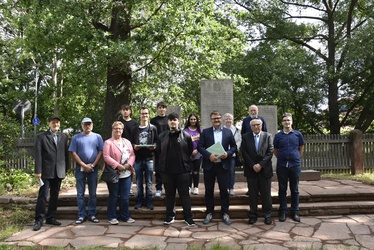 Schüler*innen der St. Ursula-Schule mit Lehrerinnen Frau Rohland und Frau Gatzemeier, Bürgermeister Thorsten Feike, Bodo Riethmüller vom Landesverband der Jüdischen Gemeinde Niedersachsen, Tobias Schläger von der Partnerschaft für Demokratie und als freiwillige Helfer der Rentnergruppe Mingerode Herr Wüstefeld und Herr Schönberg (Bild: Stadt Duderstadt)