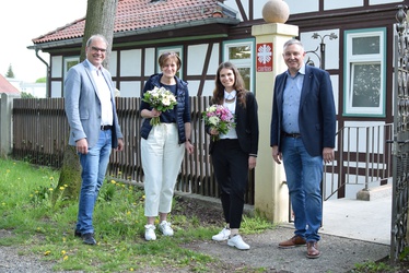 Die Caritas-Vorstände Holger Gatzenmeyer (l.) und Ralf Regenhardt (r.) gratulieren zum Start der neu strukturierten Geschäftsbereiche der Caritas Südniedersachsen den beiden Leiterinnen Heike Jagemann (Kindertagesstätten, 2.v.l.) und Isabel Lubojanski (Familienunterstützende Dienste, 2.v.r.) (Bild: Johannes Broermann)