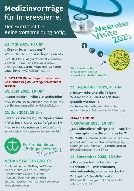 Auch in 2025 bietet das Ev. Krankenhaus Göttingen-Weende mit der Veranstaltungsreihe 'Weender Visite' sechs interessante Vorträge an. Die 'Weender Visite' ist eine Veranstaltungsreihe des Evangelischen Krankenhauses Göttingen-Weende. Die Vorträge geben Interessierten die Möglichkeit, mit den Experten des Krankenhauses aus verschiedenen medizinischen Fachrichtungen ins Gespräch zu kommen. In den rund einstündigen Veranstaltungen werden aktuelle Themen der Medizin in verständlicher Weise vorgestellt, und es wird über Neuerungen bei der Diagnose und Therapie unterschiedlicher Krankheitsbilder berichtet. Neben der Information gibt das Patientenforum auch Gelegenheit zur Diskussion mit den Referenten und zur Beantwortung persönlicher Fragen.